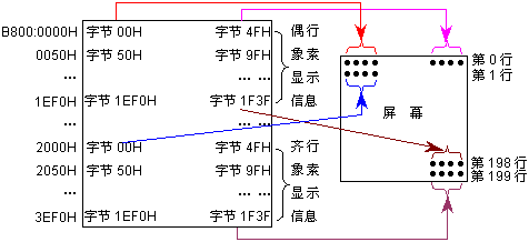在具体存储过程中,它又把偶数行象素和齐数行分开来存储。偶数行和齐数行的象素总数各有32000个,也都需要8000个字节来存储,并规定:偶数行象素从0B800:0000H开始存储,齐数行象素从0B800:2000H开始存储。该显示模式的存储形式如图8.8所示。