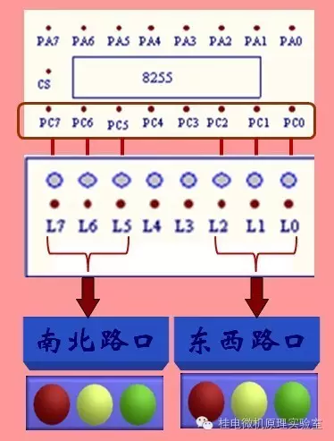 若用C口作为十字路口模拟交通灯的控制时,则作为南北路口的交通灯,分别与并行接口8255的引脚PC7、PC6、PC5相连,作为东西路口的交通灯,分别与并行接口8255的引脚PC2、PC1、PC0相连。