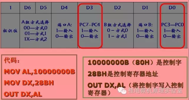 方式0是基本的输入/输出方式,该方式下的A口8位和B口8位可以由输入的控制字决定为输入或输出,C口分为高4位(PC4-PC7)和低4位(PC0-PC3)两组,也由控制字决定其输入或输出。需要注意的是在该方式下,只能将C口其中一组的四位全部置为输入或输出。