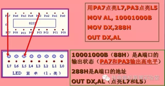 (5)发光二级管为共阴极,使其点亮应使8255A相应端口的相应位送1,否则送0。